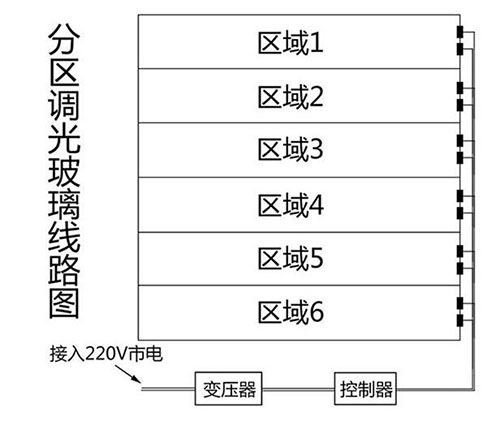 分區,是通過技術手段,把調光玻璃中的液晶膜分成若干個獨立的、不交織的片區,讓液晶膜“分而不斷”,從而實現對每個片區通斷電的單獨控制,讓玻璃顯示透明或霧化效果的圖案,這就是分區調光玻璃。